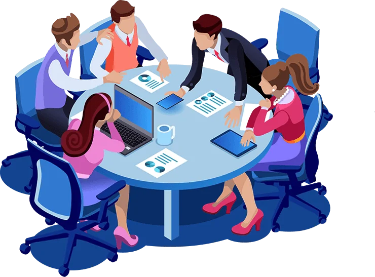 2.  A vector illustration of a diverse team of five business professionals seated around a round table, collaborating on a digital marketing strategy. They are looking at papers with charts, a laptop, and a tablet, symbolizing planning, execution, and analysis, which are core services of a skilled Digital Marketing Freelancer in Bangalore